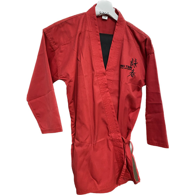 Hochwertiger Kampfsportanzug in rot / schwarz für Kinder und Jugendliche bis zu einer Körpergröße von 170 cm. Rote Jacke mit Bestickung vorne "Ving Tsun" in chinesischer Schrift und Lateinschrift. Rückseite ist mit dem Martial Arts Center Logo bestickt. Die schwarze Hose hat die gleiche Bestickung, wie die Vorderseite der Jacke. Enthält noch einen weißen Gürtel.